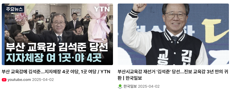 - 인지도: 김석준 후보는 이미 2014년부터 8년간 부산시 교육감을 지낸 경험이 있어 인지도가 높았다.