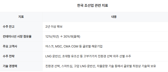 🚢 LNG 운반선, 초대형 컨테이너선, 해양플랜트 선박 등 고부가가치 선박 분야에서 한국이 압도적인 경쟁력을 보이며, 대규모 발주가 이어지고 있습니다.