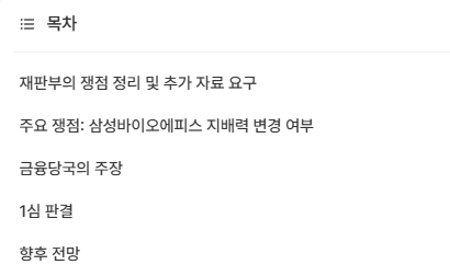 - 재판부는 2011~2014년 기간 동안의 지배력 변경 이벤트 유무를 핵심 쟁점으로 보고, 이에 대한 판단 자료를 추가로 요구했다.