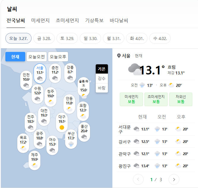 ※ 본 일기예보는 2025년 3월 27일 오전 9시 기준 기상청 발표 자료를 바탕으로 작성되었습니다.