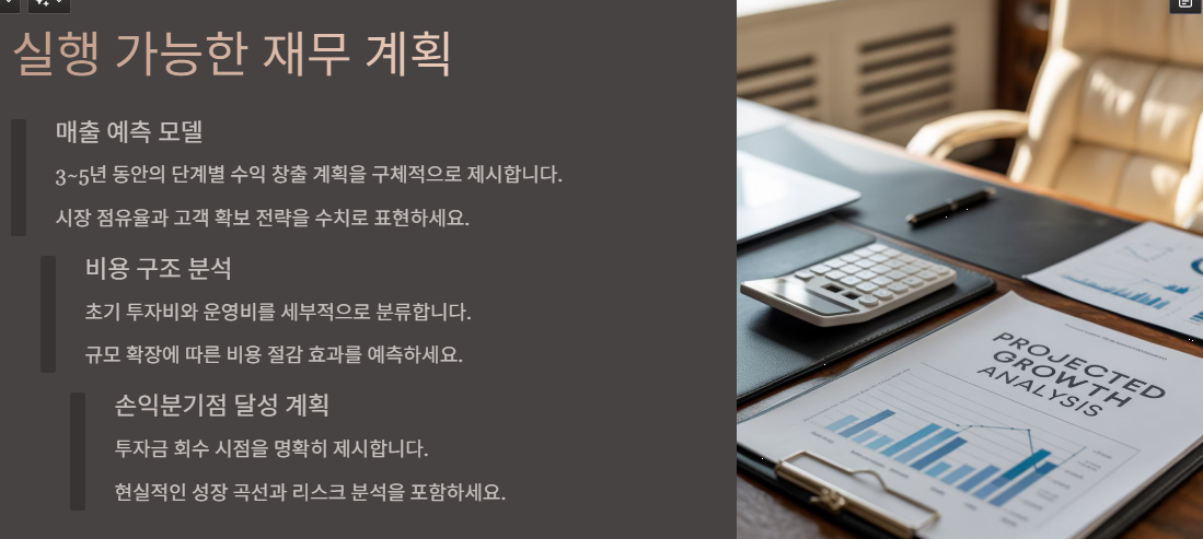 이 3가지를 충족하는 순간, **계획서는 단순한 문서가 아닌 ‘투자의 청사진’**이 됩니다.